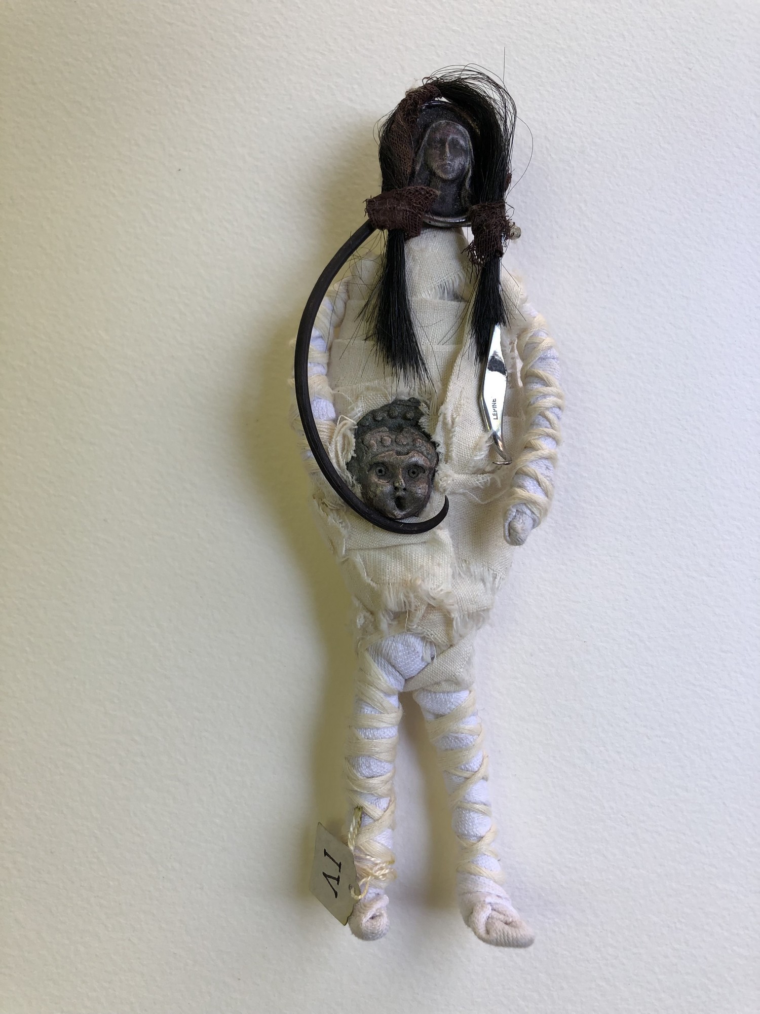 POUPEE N° 4 ← Précédent POUPÉE N° 4 – Tissus – Céramique – Moitié de ciseau Lepine – Cheveux – Bogue de plante – 20 cm X 7 cm.