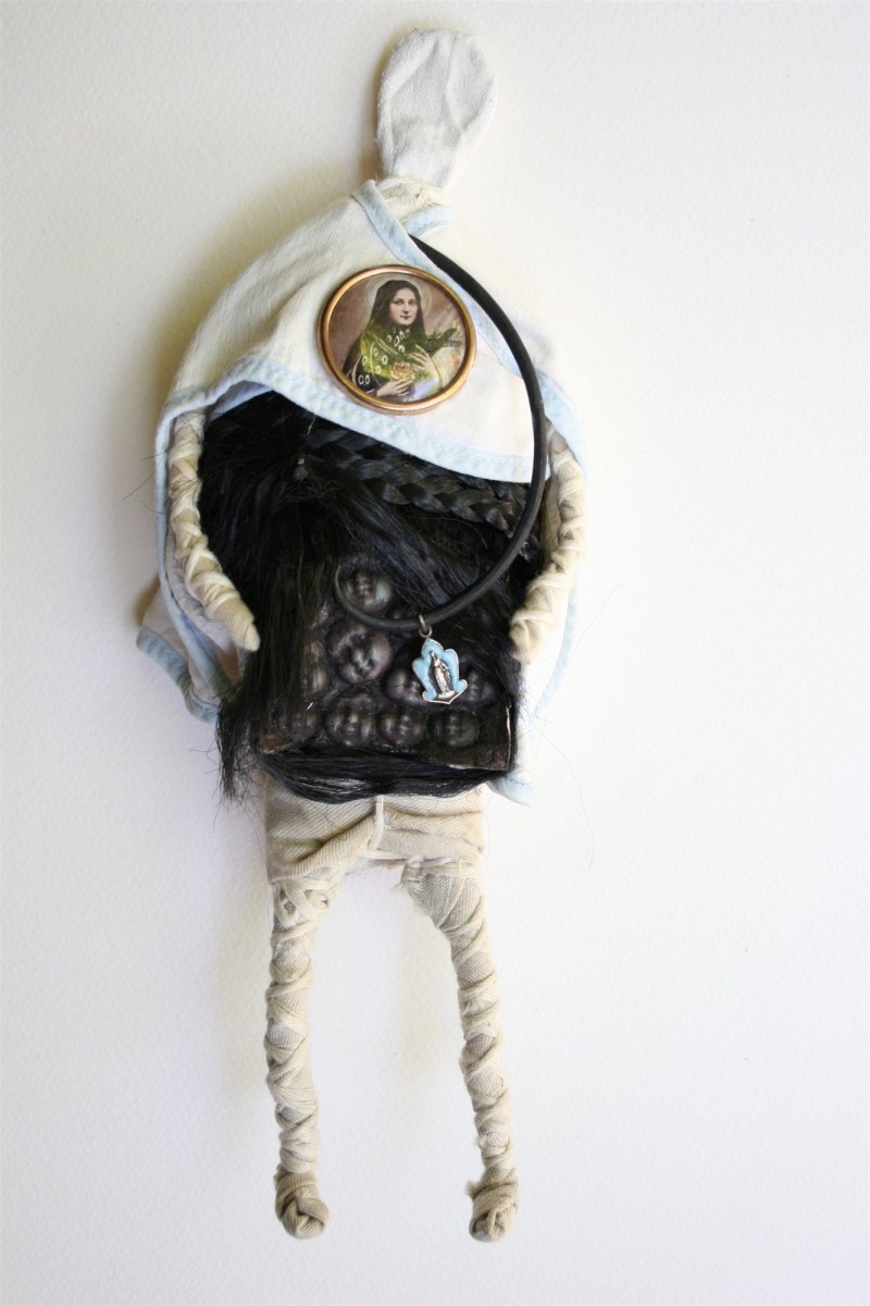POUPEE N° 7 ← Précédent Suivant → POUPÉE N° 7 – Tissus – Cheveux – Céramiques – Médaille pieuse – Broche de Sainte Thérèse – Bois – 29 cm X 11 cm.