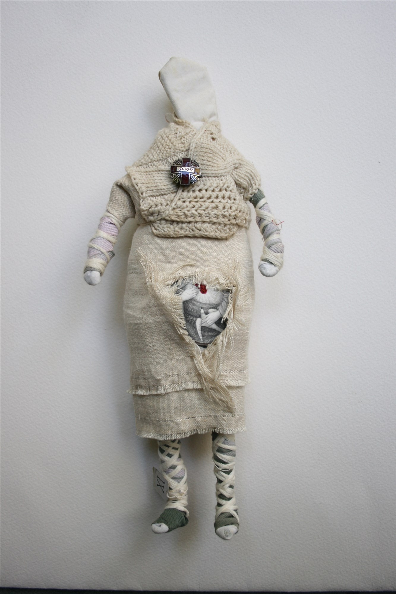 POUPEE N° 9 ← Précédent Suivant → POUPÉE N° 9 – Tissus – Médaille »sang » – Coeur brodé – Petit châle tricotée – 28 cm X 12 cm.